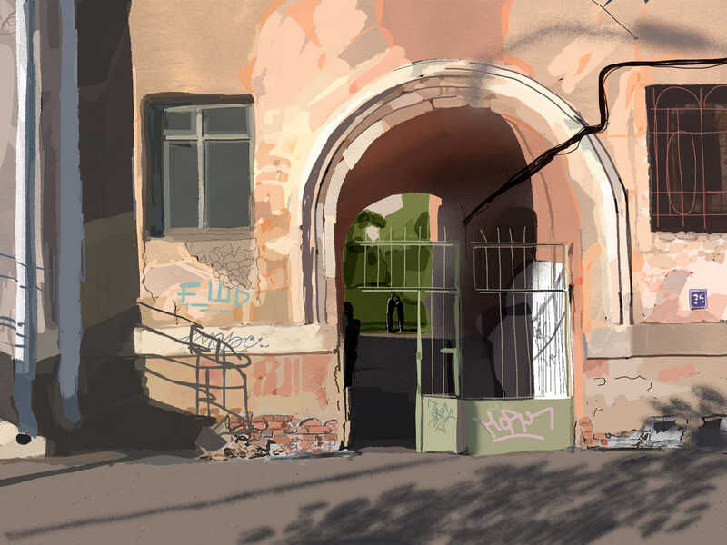 – Для панорамных скетчей использовал карандаши, соус, маркеры, сангину (красный мел), линеры (капиллярные ручки), пастель, гуашь, тушь, брашпены (ручки-кисточки). Цифровая живопись – пальцем на айпаде в графических редакторах. Портреты домов – акварель, подпорченная фотошопом. Красоты архитектуры — чистый вектор.