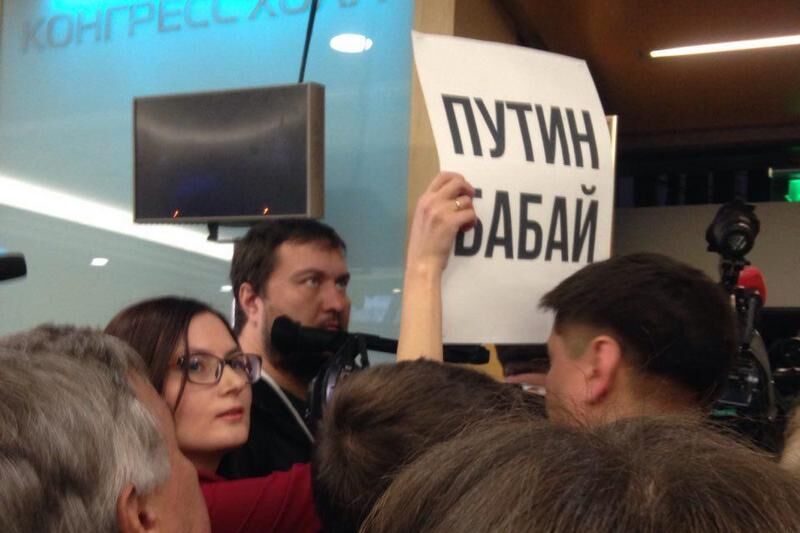 Прозвучал вопрос, не скучно ли участвовать в выборах, если оппозиция не вырастила нормального кандидата. Перед тем, как на него ответить, Владимир Путин обратился к корреспонденту, которая держала табличку с надписью «Путин Бабай».