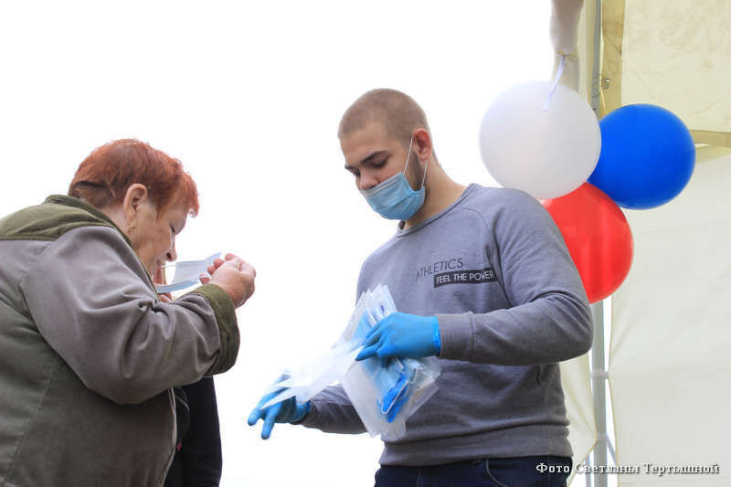 Волонтеры следят, чтобы избиратели соблюдали социальную дистанцию, не толпились и ждали своей очереди. У входа в шатер измеряют температуру, дезинфицируют руки.