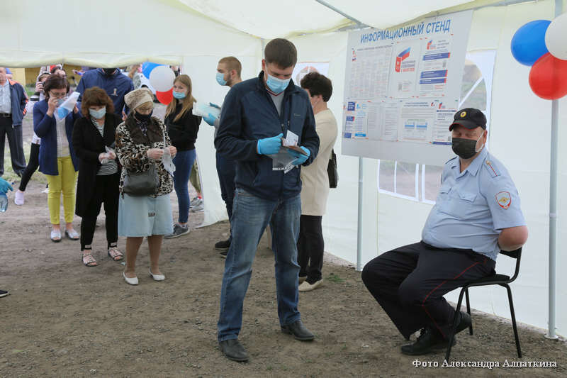 Подготовили индивидуальные средства защиты, бесконтактные термометры. Члены комиссии и волонтеры – в защитных масках-шлемах, на руках – перчатки. В воздухе – запах дезинфицирующего раствора. Списки на месте, чистые бюллетени – тоже. Урна ждет. И люди ждут – собираются у входа в шатер. В 16:00 началось голосование по поправкам в Конституцию РФ.