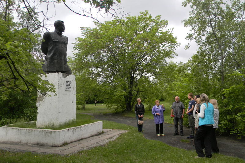 Увлекательную экскурсию в Кургане провела историк и краевед Валентина Шабалина. Валентина Максимовна не только напомнила интересные факты из биографии красного командира, но и ознакомила путешественников с памятниками Пичугину, установленными в нашем городе. Его мраморный бюст работы курганского скульптора А. И. Козырева хорошо известен всем, кто хоть раз бывал в сквере на улице Коли Мяготина. Но только внимательные историки знают про допущенную на постаменте ошибку — год рождения Пичугина там указан неверно.