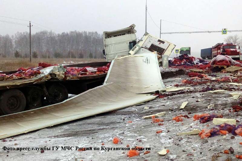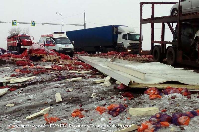 Информация о ДТП поступила в дежурную часть сегодня, 18 ноября, в восемь утра. На 240 км трассы Р-254 «Иртыш» в Кетовском районе Курганской области столкнулись две груженые фуры: одна с овощами, другая — с легковыми авто.