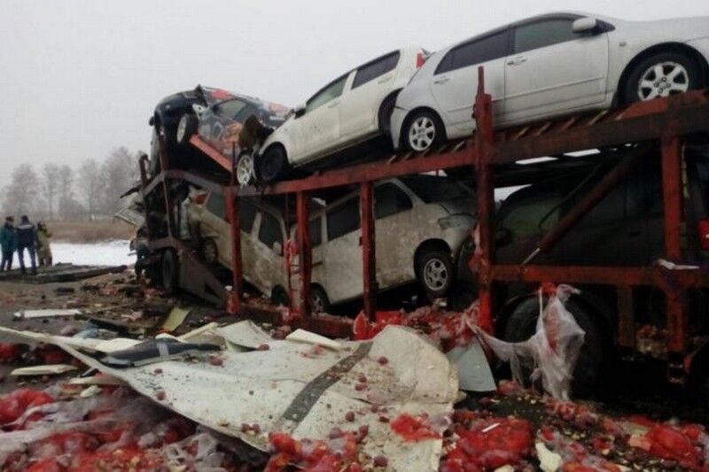 Помидоры и покореженные детали машин раскидало по всей дороге, на участке сразу же образовалась огромная пробка.