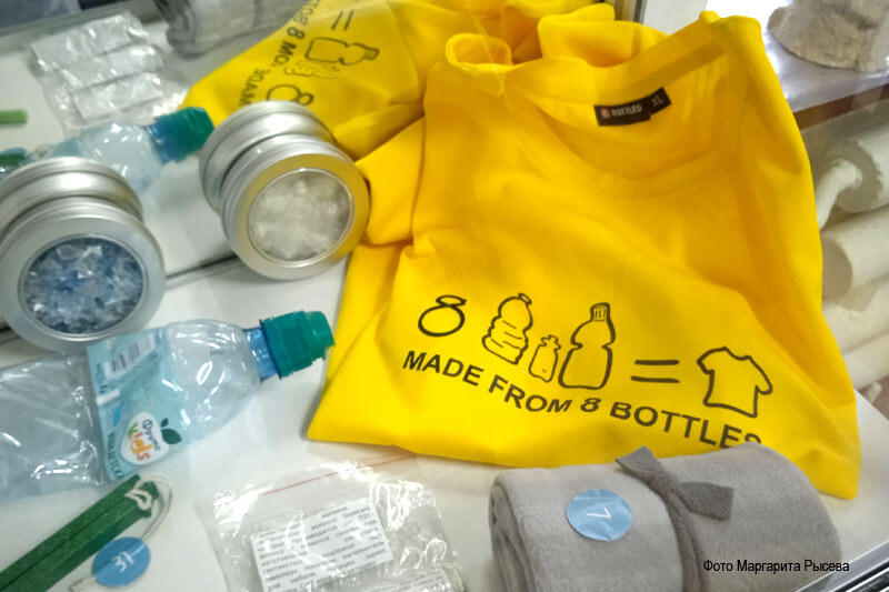 Из волокон, полученных в процессе переработки ПЭТ-бутылок, получают даже искусственный войлок. Именно из него сделан представленный на выставке пенал. В пенале лежит сделанная из раздробленных зубных щёток шариковая ручка, рядом с ней – блокнот, обложка которого произведена из переработанной макулатуры.