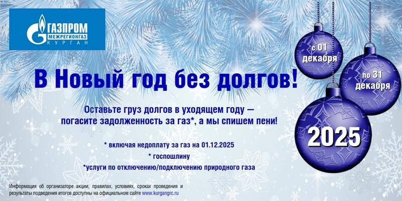 «Газпром межрегионгаз Курган» с 1 по 31 декабря 2025 года проводит акцию для абонентов-физических лиц по списанию всех начисленных пеней, сообщает пресс-служба компании. Для участия необходимо полностью погасить задолженность за газ и оплатить потребление за ноябрь.