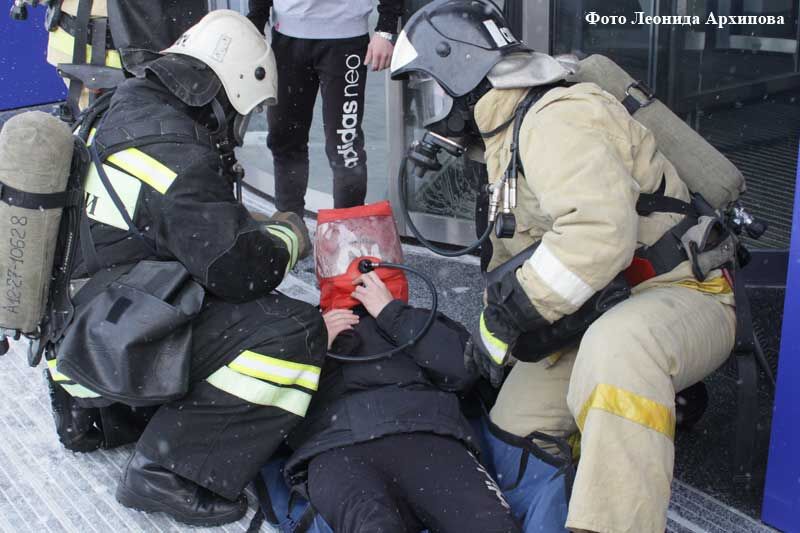 Несколько лестничных маршей — и вот уже сотрудники МЧС находятся на втором этаже «Гипер-Сити», в детском развлекательном комплексе «Zамания». Здесь, в кафе, обнаружены пострадавшие — кто-то упал головой на столик, кто-то оказался на полу. Сразу же на них надевают специальные дыхательные устройства, тех, кто могут ходить — выводят, тех, кто не может самостоятельно передвигаться — укладывают на носилки.