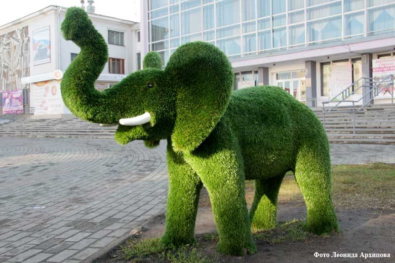 У Дворца культуры машиностроителей — зеленый слоник. Это первый топиарий, который появился в Кургане. Рядом — желающие сделать фото на память. Правда, некоторые злоупотребляют беззащитностью слоника — в соцсетях уже появились снимки взрослых мужчин верхом на артобъекте. Так он долго не простоит, надо бы поосторожнее — топиарий для красоты, а не для верховой езды.