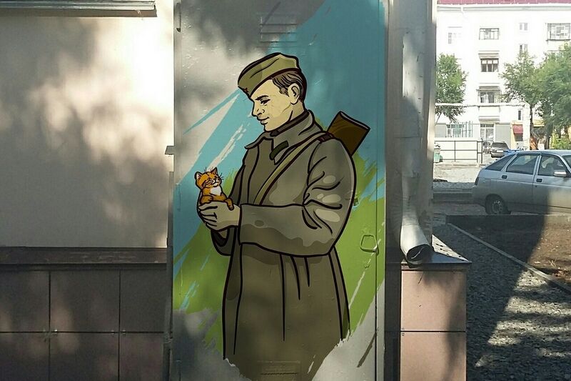 Перед 9 Мая ребята планируют преобразить телефонный шкаф возле Вечного огня – нарисовать солдата с котенком на руках (автор эскиза – Александр Юзва).