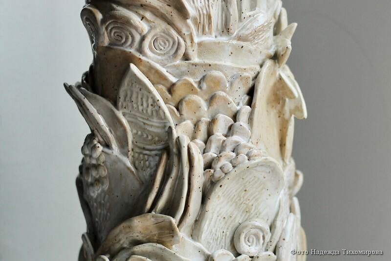 Тем не менее в работе художница ориентируется на модные тенденции: фактурные вазы с переливами глазури, простые формы с художественной росписью, любые панно.