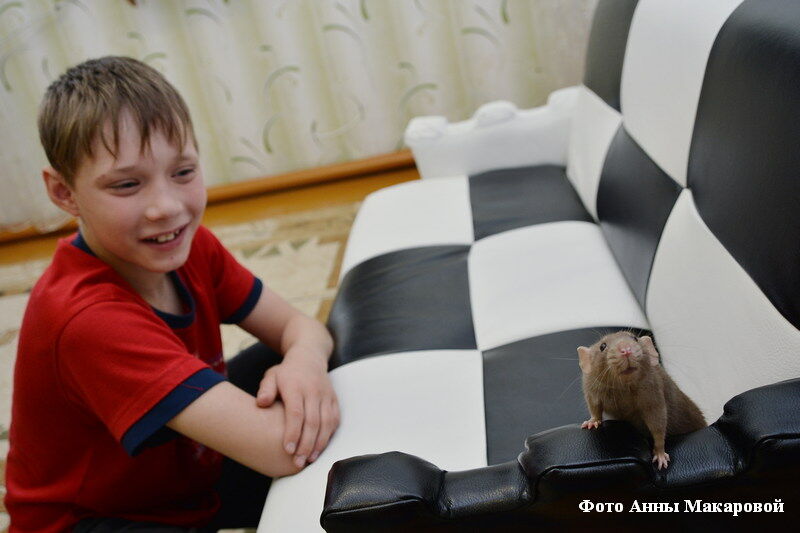 О том, что крыски, как минимум таблетка от грусти, свидетельствует детский смех, которым сразу же наполняется детский дом при их появлении. И вот уже ребятня оккупировала хвостатых питомцев. Одни расхаживают с понравившимся крысом на плече, другие прижимают к себе и гладят, а кто-то даже норовит чмокнуть в носик или расчесать шерстку гребешком. Крыски, в свою очередь, выделывают забавные кульбиты, подставляют спинки под поглаживания и лижут руки. «Давай поменяемся….дай мне лысого подержать, а тебе мохнатого», — активно передают крыс из рук в руки дети.