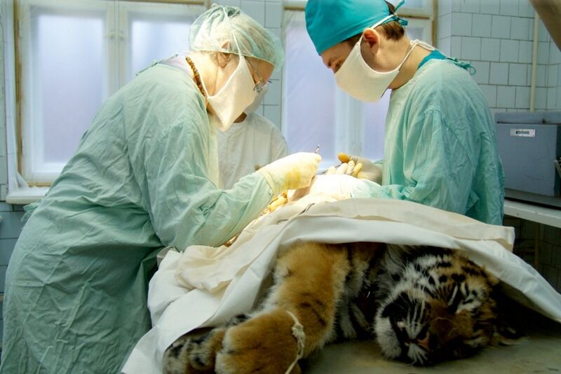 В 2000-х у нас был необычный пациент — шестимесячный тигренок. Его к нам привезли из цирка — с множеством переломов. У тигренка был рахит, про таких говорят «хрустальные» пациенты. Коллеги его оперировали, армировали спицами. С установкой аппарата было сложно, потому что кости мягкие, наружные фиксаторы было ставить нецелесообразно. Поэтому в данном случае ставили внутренние фиксаторы.