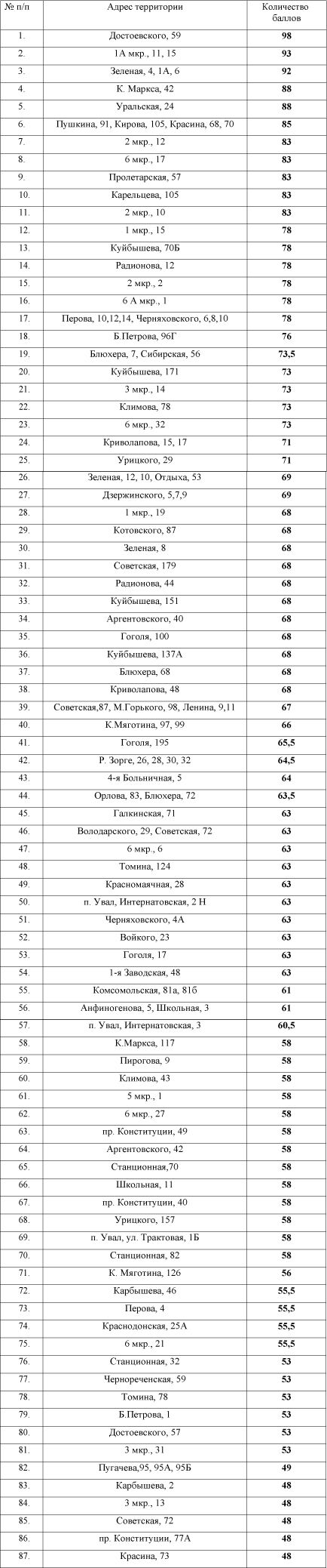 Помимо заявок 2018 года, как и обещали муниципальные власти, в программу включены обращения прошлого года, которые тогда не прошли отбор на стадии общественной комиссии. Напомним, что всё-таки окончательное решение остаётся за администрацией города, которая может отложить благоустройство в конкретном дворе по причине, например, планируемого ремонта инженерных сетей. В общей сложности более сотни заявок 2017 года присоединились к общему числу, причём 55 из них были доработаны. Таким образом в рейтинг вошли 285 дворовых территорий. Их оценка составляет от 98 баллов (это наивысший результат, который получили жильцы дома по адресу ул. Достоевского, 59) до 8 баллов. Они присуждены сразу нескольким домам, замыкающим перечень. Все эти территории общественная комиссия единогласно рекомендовала для включения в программу.