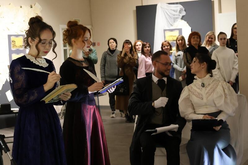 Началась церемония открытия, как двести лет тому назад в лучших домах: нарядные кавалеры и дамы в костюмах XIX века встречали гостей у входа в Курганский областной дом народного творчества.
