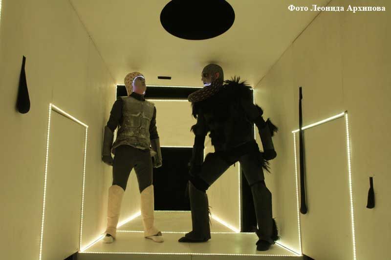 Сцена необычной конструкции трансформировалась в огромный белый туннель, уводящий в неизвестность. Вырывающиеся из стен копья-стрелы пронзали пространство, нагнетая атмосферу тревожности с первых минут – шла охота на кабана, но если на стене появляется копье, оно кого-нибудь да ранит в финале – законы театра непреложны.