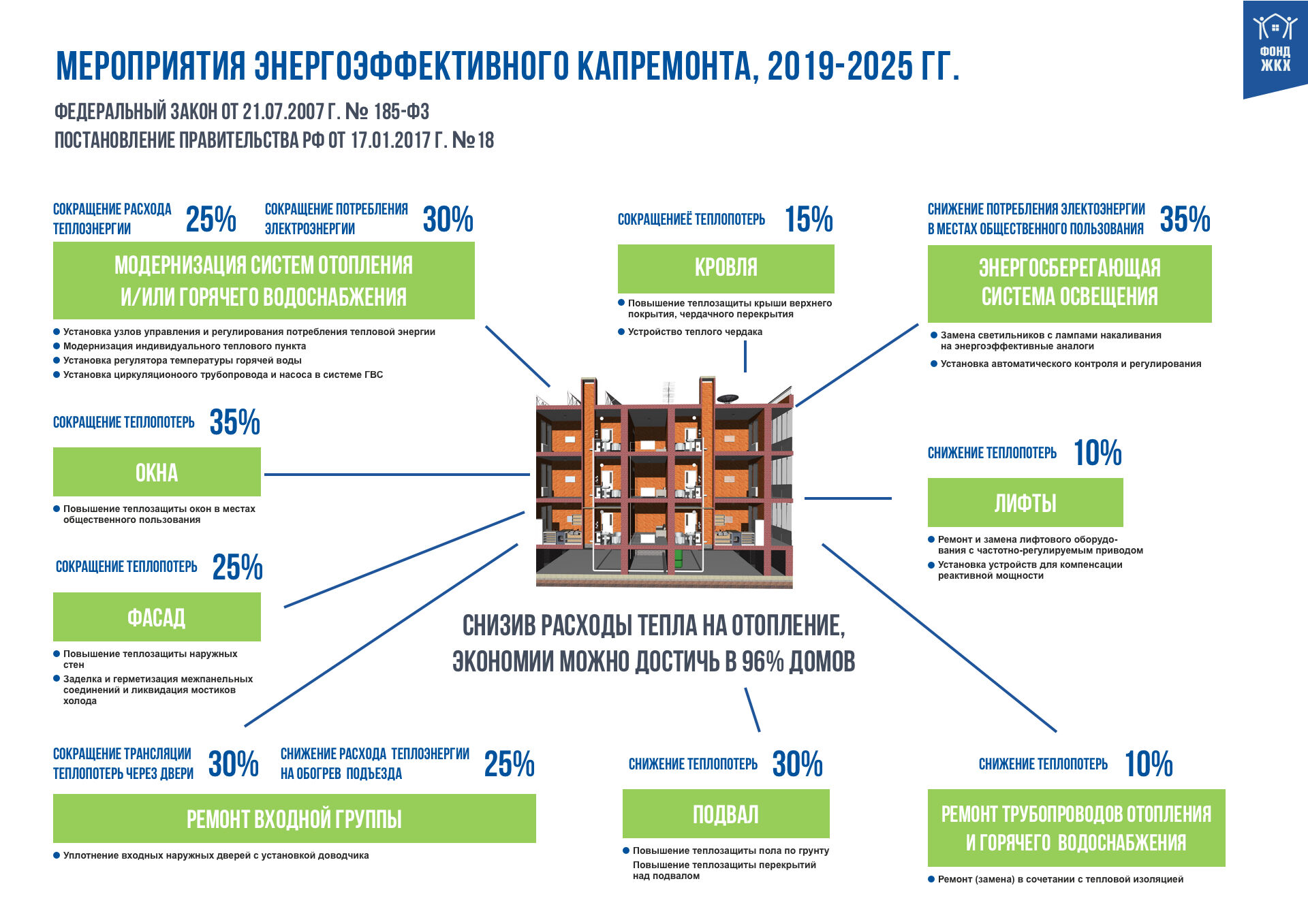 Экономия на энергоресурсах после проведенных мероприятий по энергосбережению должна составлять не менее 10%. В числе этих мероприятий: ремонт внутридомовых инженерных систем отопления и (или) водоснабжения, установка и модернизация узлов регулирования и потребления, ремонт и замена лифтового оборудования, а также ремонт и утепление фасадов, ремонт крыш.