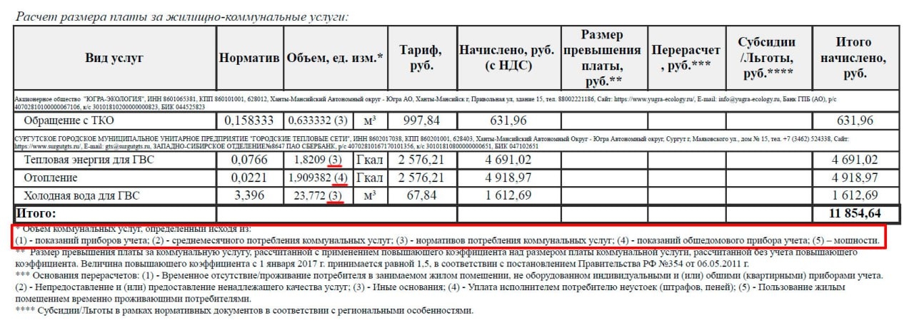 «В колонке «Объем» платежного документа отражается способ расчета. Цифра «1» в скобках означает начисление по показаниям прибора учёта, «2» — по среднемесячному потреблению, что говорит о непоступлении показаний, «3» — по нормативу, а это при наличии исправного счетчика свидетельствует о том, что данные не передавались более трёх месяцев», — пояснили в пресс-службе компании.