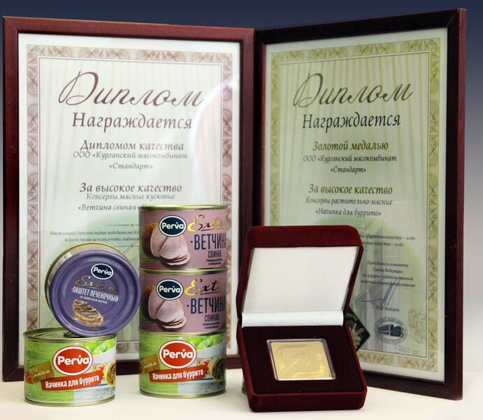 На суд жюри курганский мясокомбинат представил консервацию: паштет, ветчину и начинку для лаваша — инновационное изобретение, которого нет в ассортименте ни одного другого предприятия. Это новинки. Продукты выпускаются под новой торговой маркой Perva (что означает — всегда и во всем первый).