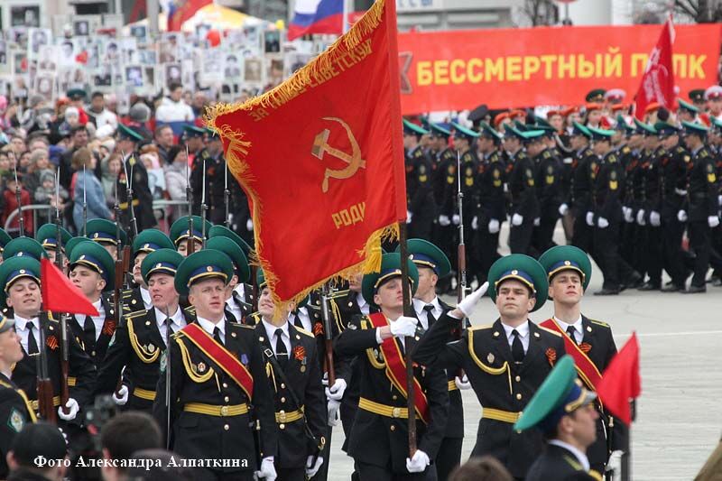 Взвод почетного караула Курганского пограничного института ФСБ России впервые на параде продемонстрировал показательное выступление. Творческим подарком от танцевальных коллективов областного центра стал номер «И все о той весне».