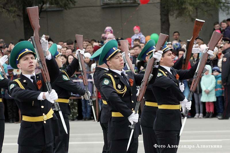 Открыли парад колонны Курганского пограничного института ФСБ России. В строю — сыновья, внуки и правнуки героев Великой Победы, хранители боевых традиций, у истоков которых стояли герои-пограничники Андрей Бабушкин, Михаил Шмагрин, Андрей Кижеватов, Никита Карацупа и многие другие. Выпускники института остаются верны героическим традициям прошлых лет. Они с честью продолжают выполнять воинский долг в нелегких условиях, порой с риском для жизни.