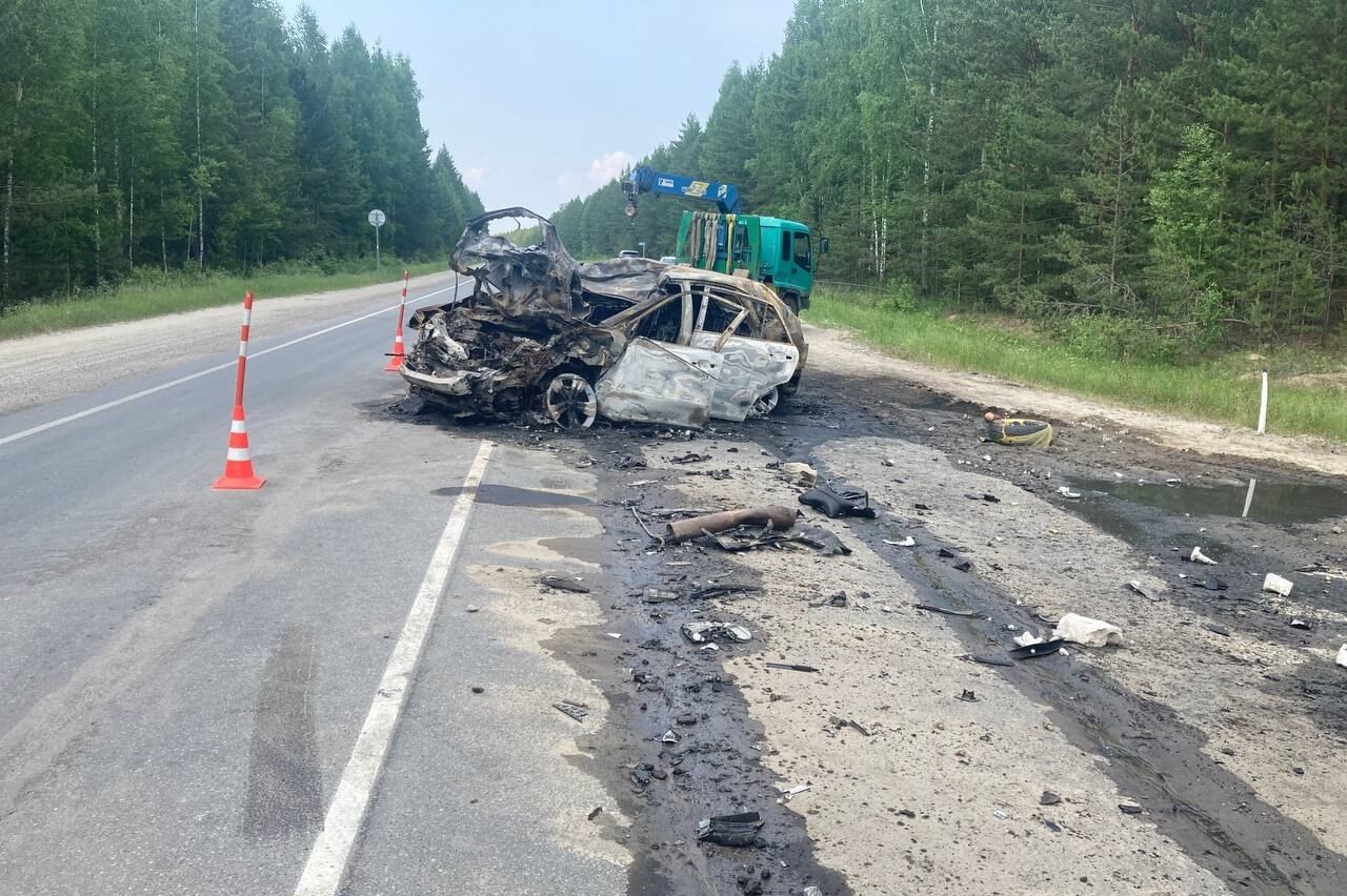 По предварительным данным Госавтоинспекции Тюменской области, водитель автомобиля Lexus выехал на встречную полосу для совершения обгона, но ему помешал встречный транспорт. При попытке вернуться в свою полосу легковая иномарка въехала в заднюю часть грузовика MAN и загорелась.