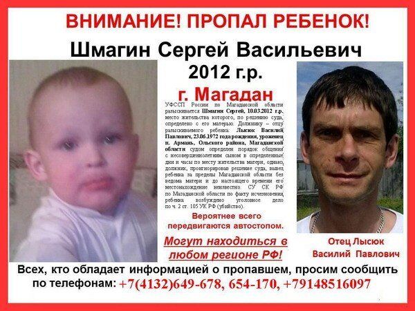 Судебные приставы из Магаданской области разыскивают 4-летнего мальчика Шмагина Сергея Васильевича 2012 года рождения. В июле 2014 года по решению Хасынского районного суда Магаданской области определено, что он должен проживать со своей матерью, Н.А.Шмагиной. Однако ребенок был похищен собственным отцом, Лысюк Василием Павловичем, и вывезен за пределы Магаданской области. Отделом по расследованию особо важных дел СУ СК России по Магаданской области по факту безвестного исчезновения малолетнего С.В.Шмагина возбуждено уголовное дело.