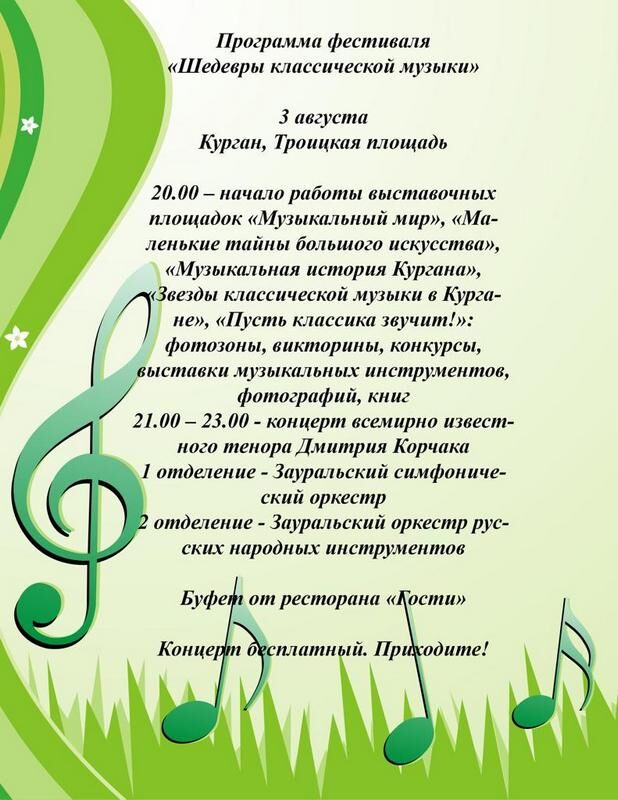 - Площадка Курганской областной филармонии «Музыкальный мир» (гости праздника смогут принять участие в фотосессии на фоне разворота нотной тетради рядом с музыкальными инструментами, проверить свою интуицию в игре «Верю — не верю», проверить свои знания композиторов в игре «Узнай композитора по шаржу», а также принять участие в музыкальной викторине и получить небольшие призы)