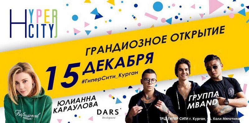 15 декабря состоится торжественное открытие обновленного ТРЦ «ГиперСити» (Hyper City). Хэдлайнерами программы станут популярная группа MBAND и певица Юлианна Караулова.