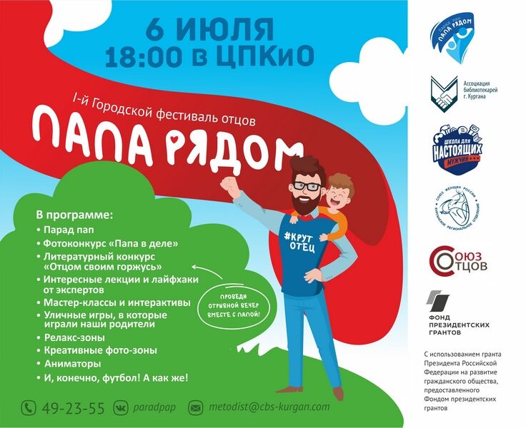 В рамках фестиваля папам Кургана предстоит пройти несколько испытаний и поучаствовать в Параде отцов. Стать участником может любой желающий глава семьи. Зрителям будут предложены также развлекательные программы, лекции, уличные игры, интерактивы, мастер-классы, фотозоны и непременный футбол.