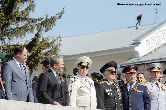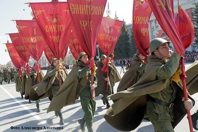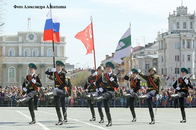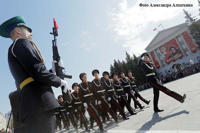 …Начинается военный парад. На площади — штандарты фронтов Великой Отечественной войны. Торжественным маршем проходят офицеры и курсанты Курганского пограничного института ФСБ России. В этом году институт отмечает свое 55-летие. Более 300 выпускников военного учебного заведения награждены боевыми орденами и медалями. В праздничном строю проходят сотрудники правоохранительных структур, курганские кадеты. На площади боевая техника производства знаменитого Курганмашзавода: БМП-3 и бронетранспортер «Ракушка». По традиции парад завершает военный духовой оркестр Курганского пограничного института.
