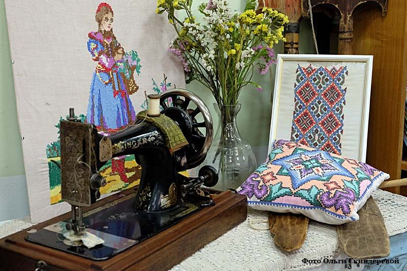 Ольга Николаевна принесла нам, кроме вышивок своей бабушки, много необычных старинных предметов. Это маслобойка, сундук, ухват с отполированной многими поколениями хозяек ручкой, плетеный короб для грибов, ягод и овощей, прялки и веретено, крынки для молока и теста, и даже швейная машинка легендарной фирмы «Зингер» в рабочем состоянии.
