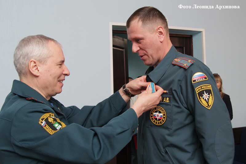 Он наградил сотрудников памятными подарками в виде ведомственных наград МЧС России, почетных грамот и благодарностей, а также вручил очередные специальные звания.