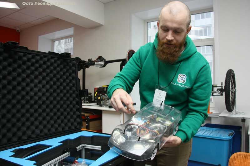 «У нас есть радиоуправляемые машины, на примере которых школьники изучат альтернативные источники энергии. В ней установлены два мотора, драйвер, радиоприёмник и батарея и два водородных элемента. Водород проходит через трубки, поступает в генератор, где преобразуется в электрическую энергию, от которой вращается двигатель. Автомобиль можно подключать к компьютеру, чтобы сразу получать все данные исследований», — объясняет педагог технопарка «Кванториум» Станислав Колмаков.