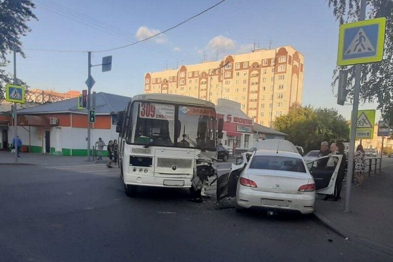 Водитель автобуса ПАЗ поворачивал с улицы Савельева на Советскую на зелёный и врезался в автомобиль Peugeot 308, ехавший прямо по первой полосе в сторону улицы Куйбышева.