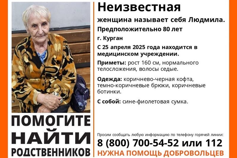 Как сообщили в поисковом отряде «ЛизаАлерт» Курганской области, сама женщина называет себя Людмилой. На вид ей около 80 лет. Рост около 160 см, нормального телосложения, волосы седые. В момент обнаружения была одета в коричнево-черную кофту, темно-коричневые брюки, коричневые ботинки, при себе имела сине-фиолетовую сумку.