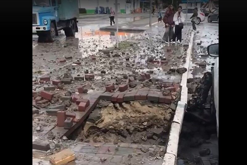 В Кургане 19 июня во время гидравлических испытаний тепломагистрали «Юг» на участке от насосной по ул. Зорге до ул. Сергея Васильева лопнул трубопровод. Фонтан воды выбил тротуарную плитку на парковке возле ТРЦ «Пушкинский».