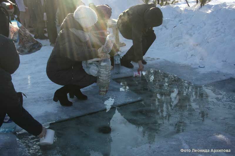 Неподалеку от прорубей люди набирали святую воду. Большинство пришли с пластиковыми бутылями разного объема – кто-то ограничился полторашкой, кто-то начерпал себе пять литров, чтоб с запасом. Но самым запасливым оказался мужчина в шапке-ушанке, пришедший за водой с ведром.