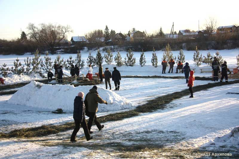 На Бабьих песках устроены огороженная елочками площадка, палатки для переодевания, пункты обогрева, деревянные скамейки и покрытые соломой дорожки. Нов этот раз добавилось музыкальное сопровождение: бородатый веселый мужчина в толстой фуфайке играл на баяне и еще каком-то явно самодельном инструменте – изогнутая дугой гибкая металлическая полоса, на которую было что-то навешано, гремела от надавливания ногой на ее конец. Звучало забавно, да и играл он неплохо, поэтому горожане охотно бросали в футляр от баяна не только монеты, но и мелкие купюры. Когда я добралась, он как раз заканчивал наигрывать песенку крокодила Гены из известного советского мультика, которая: «Пусть бегут неуклюже пешеходы по лужам». Нестандартный выбор.