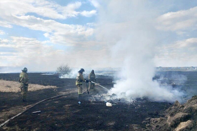«Горела сухая трава, камыш по фронту пожара 500 метров. Из-за возможной угрозы жилым домам, было принято решение о повышении ранга пожара и наращивании группировки сил и средств», — рассказывают в МЧС.