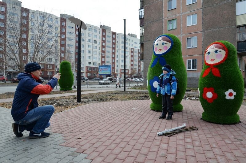 Яблоневый сквер украсила бабочка на яблоке, сквер по Куйбышева-Томина — дерево счастья. На К. Маркса, 127 установили матрешек, а на Гоголя-Савельева — медведя.