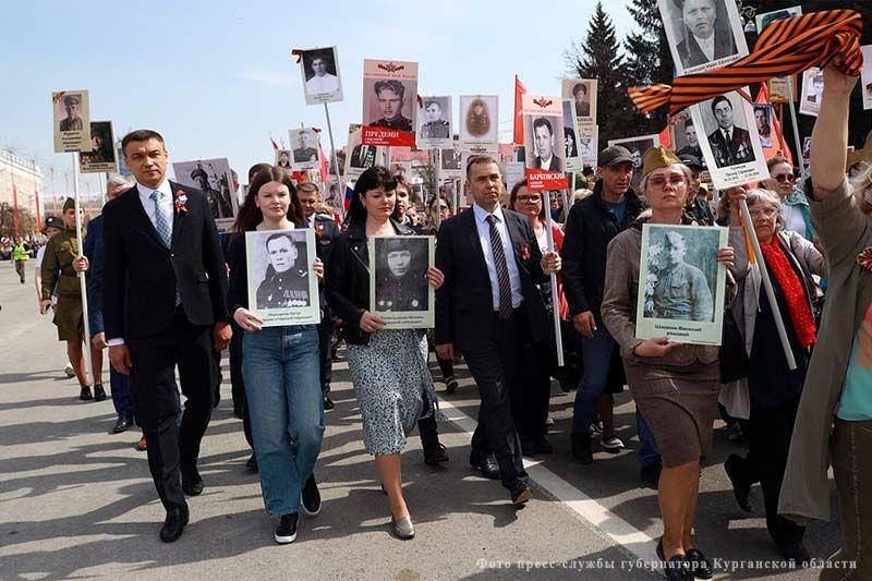 В акции участвовали губернатор Курганской области Вадим Шумков вместе с младшим сыном – они пронесли портреты двух дедов главы региона, Алексея Ивановича Барковского и Елисея Евстафьевича Предеина. Глава города Кургана Елена Ситникова вместе с дочерью также пронесла в строю Бессмертного полка портреты своих дедов, Михаила Петровича Тяжельникова и Петра Евгеньевича Чернакова.