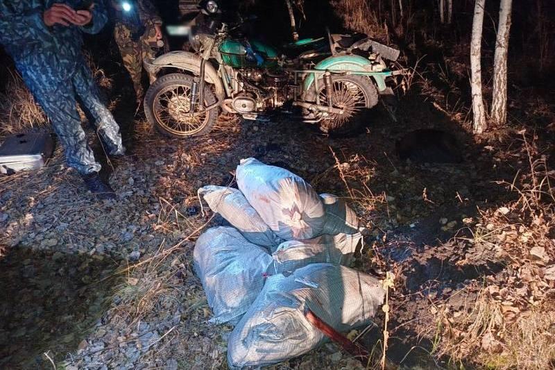 Изъяты: мотоцикл, магазины от карабинов с 16 патронами, тепловизор, охотничьи ножи, фонарики, топор со следами крови и останки животных.