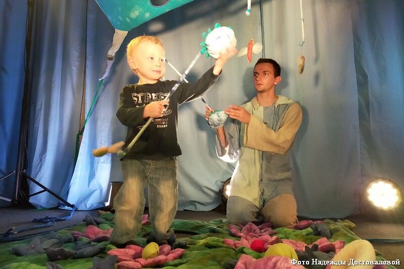 Объекты, кстати, как и авторские куклы, придумала петербургская художница Ольга Филиппова. Из всего набора предметов актеры вбирают именно то, что считают нужным в данный момент. Они, например, играют на поляне цветущих кувшинок. Оказываются то в подводном царстве, то в ягодном лесу. Мимо проплывают птицы и пролетают рыбы… «Это такая плавучая реальность, которая из мира, где мы показываем, перетекает в мир, кому мы показываем, – отметила Анна Иванова-Брашинская. – И зритель тут «два в одном». Таких родителей я называю «бэби-носцами». Мама и ребенок – это сообщающиеся сосуды, между ними все время перетекают эмоции, жидкости».