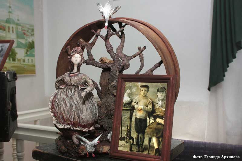 А бравый фотограф с шикарными усами и самодовольной улыбкой примостился на настоящем старинном фотоаппарате с его уменьшенной копией в технике папье-маше. Рядом та самая вылетевшая птичка. Птахи из фотоаппарата «разлетелись» по всем кукольным композициям Надежды Нечеухиной – они есть рядом с молодой дамой в стильном наряде в мехах – моднице начала прошлого века (источник вдохновения – архивное фото 19-го века), рядом с бегущей женщиной, ловящей гусей. Гуси-лебеди в сказке, известно, кружили над сестрицей и братцем. Тут же сестра и брат – персонажи реальные, это отец художницы в возрасте 6 лет и его12-летняя сестренка на фотографии с гусем, случайно «залетевшим» на фотоснимок и спрятавшимся там от куколки-хозяйки. Эту замысловатую толи сказку, толи быль художница поместила в простое сито, в котором пустило корни родовое древо.