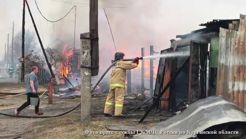 Распространению огня в считанные секунды на 2 соседних частных (по предварительным данным нежилых) дома способствовали сильные порывы ветра (в Курганской области сегодня объявлено штормовое предупреждение). Пожару был присвоен повышенный ранг «ВЫЗОВ № 3».