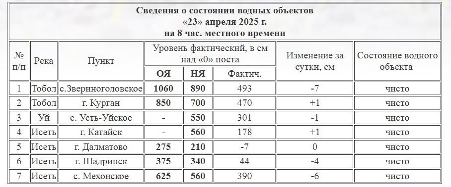 Исеть, по данным гидропоста в Катайске, прибыла на 1 сантиметр (178 сантиметров над «0»). В Далматово уровень не изменился (минус 7 над «0»). В Шадринске Исеть убыла на 4 сантиметра (44 сантиметра над «0»); в селе Мехонском – убыла на 6 сантиметров (396 сантиметров над «0).