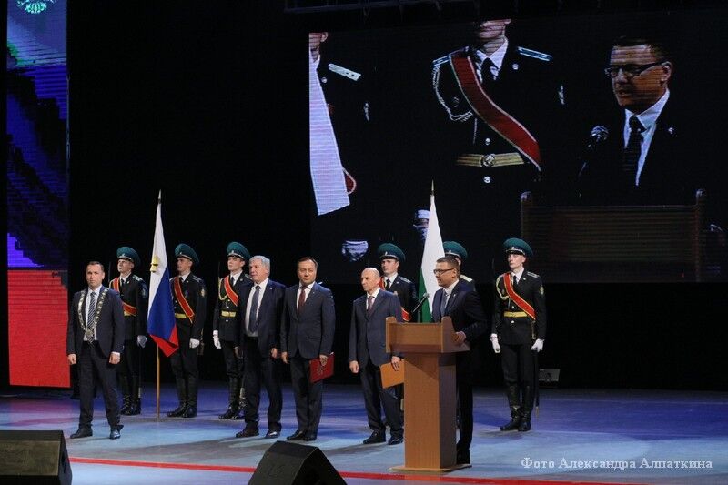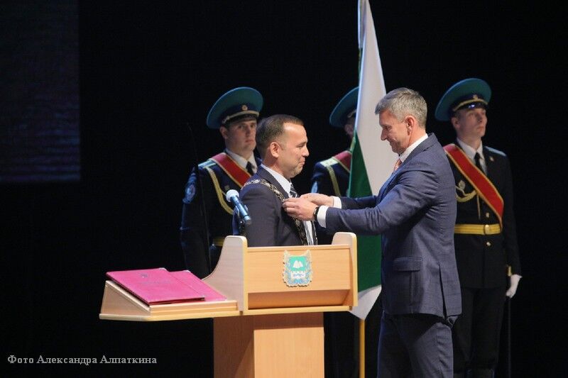Вадим Шумков произносит слова присяги: «Торжественно клянусь добросовестно исполнять возлагаемые на меня высокие обязанности губернатора Курганской области, верно служить народу, уважать и защищать права и свободы человека, соблюдать Конституцию РФ, федеральные законы, Устав и законы Курганской области».