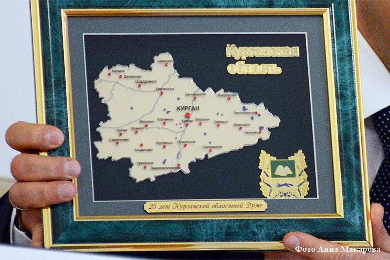 Временно исполняющий обязанности губернатора Курганской области Вадим Шумков на праздновании 25-летия Курганской областной Думы подарил депутатам карту Курганской области, инкрустированную 25 рубинами. Самый крупный обозначал областной центр.