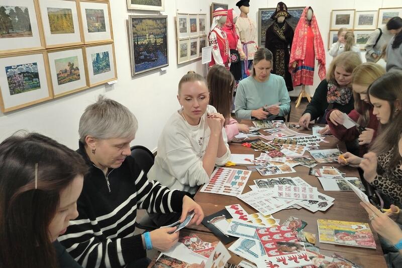 Наталья Карпович, сотрудник Курганского областного художественного музея, показывала, как делать коллаж из простых «подручных» средств — разных картинок: «Мы сегодня делаем коллаж в русском стиле, что сейчас популярно. Это фантазийная композиция, здесь полная свобода творчества, возможность проявить свой креатив. Можно оформить в рамочку и украсить домашний интерьер».