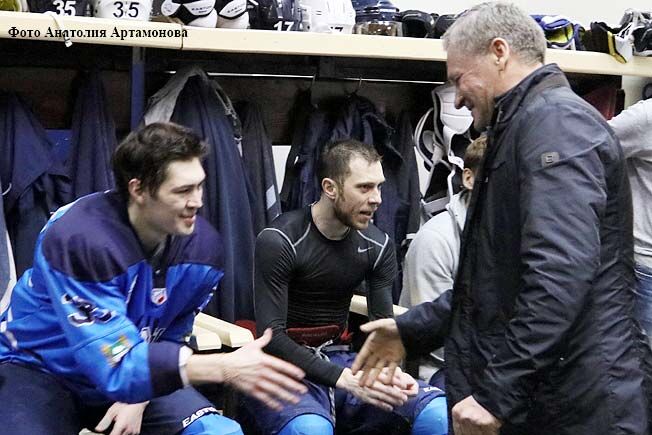 Глава Зауралья Алексей Кокорин поздравляет хоккеистов с победой.Не стоит забывать, что «Сарыарка» считалась фаворитом не только данной серии, но и входила в число основных претендентов на главный трофей. А пару лет назад казахстанцы уже выигрывали Кубок Братины. «Зауралье» же в 1/4 финала выступало впервые, но вчера сотворило настоящее чудо, как, впрочем, и во всей серии.