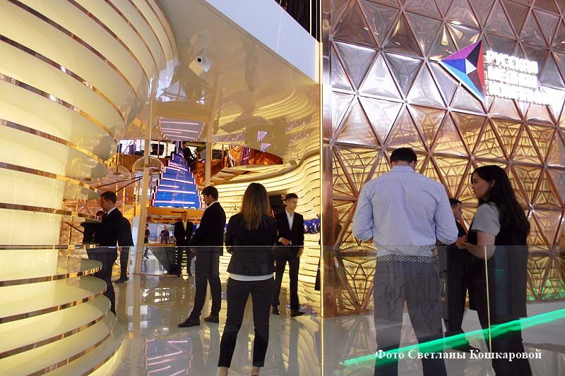 Поражали воображение вертолеты и трамваи, умные машины, занимающиеся уборкой колоссальных объемов… Масштабами красоты и роскоши ослепляла Русская медная компания: в их сверкающий павильон выстроилась очередь на фотосессии в зеркальном калейдоскопе. Удивил и Челябинский трубопрокатный завод, сделав из своего павильона настоящий… ночной клуб с диджеем, баром и дискотекой и, конечно, цифровой презентацией своего образовательного центра и производства на дижитал-столе.